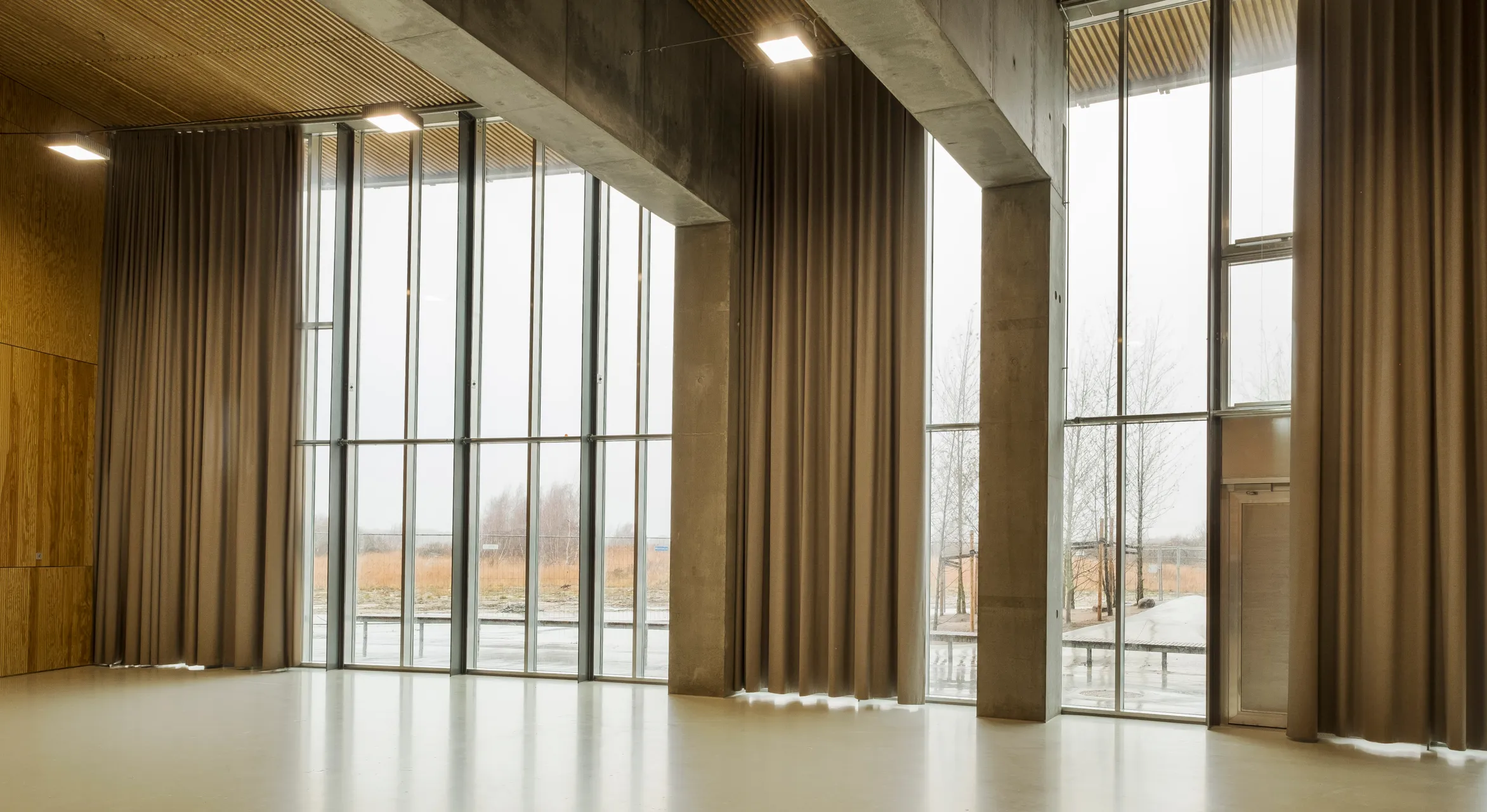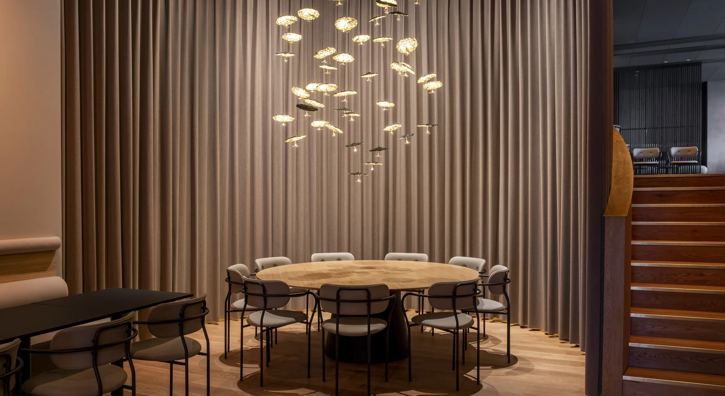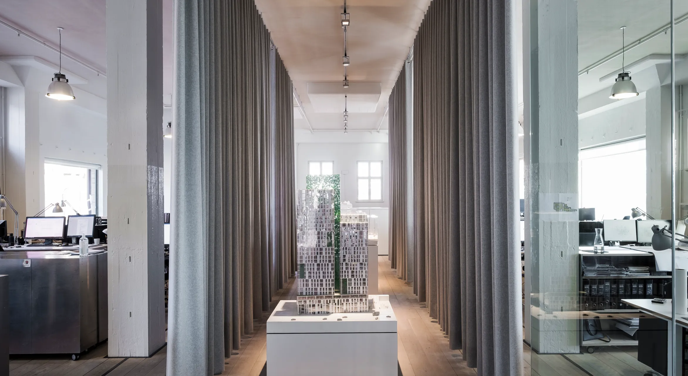 Våre akustikkgardiner i ull, filt og velur gir en myk kontrast til åpne rom, samtidig som de tettvevde tekstilene demper støy og skaper et mer behagelig inneklima.